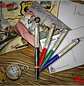 Hasta el momento, esta pluma viene en 4 colores (Negra, Roja, Azul, Verde) todos muy sesenteros. Las cuatro versiones con plumín escondido, tapa de aluminio cepillado y adornos en dorado. Solo disponible en punto M. Cuerpo de resina, con tope de color en match con el barril.