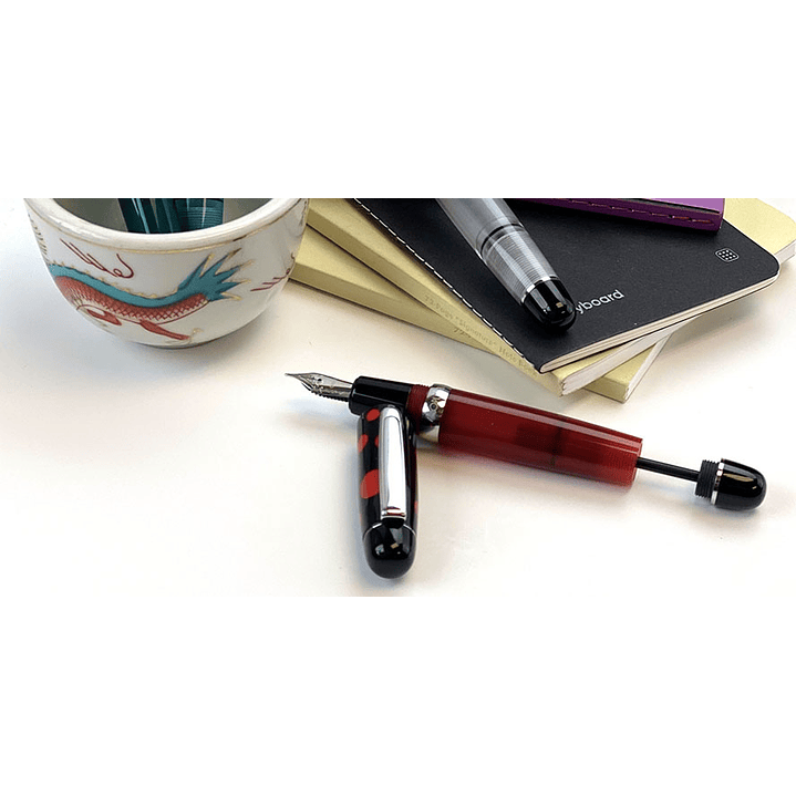 La pluma estilográfica Opus 88 Mini Pocket es una pluma con cuentagotas con un agitador de pistón incorporado. El cuerpo del bolígrafo demostrador complementa la tapa impresa. El diseño está enmarcado en negro sólido en la corona de la tapa y en el extremo opuesto del barril y tiene un acabado cromado. La silueta atrevida y la portabilidad absoluta de la pluma estilográfica Opus 88 Mini Pocket significan que tiene una pieza de declaración elegante que puede llevar a donde quiera que vaya.